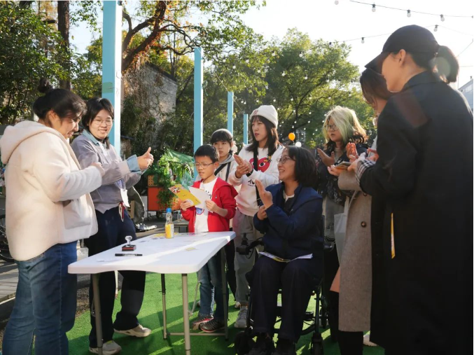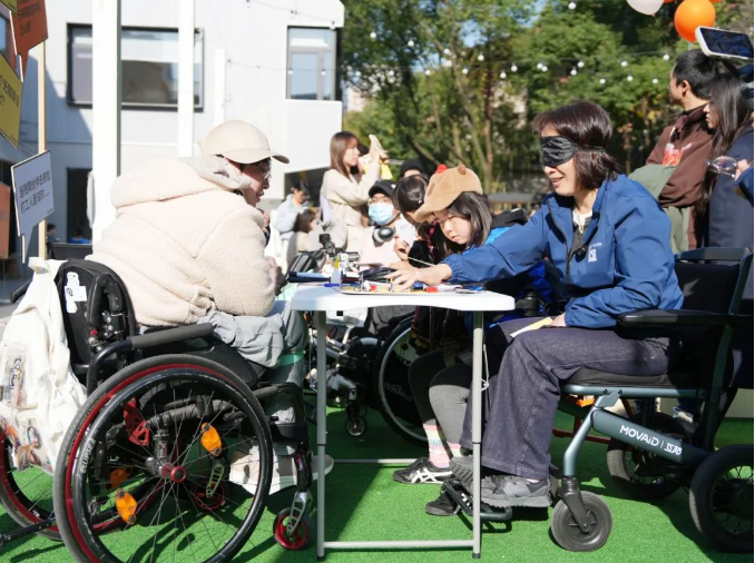 在無障礙互動(dòng)集市上,精心設(shè)置了四個(gè)體驗(yàn)區(qū)域,旨在讓參與者能夠親身體驗(yàn)特殊人群的日常生活。這里有蒙眼體驗(yàn)盲道(專為視障人群設(shè)計(jì)),有坐輪椅體驗(yàn)無障礙坡道(感受輪椅出行的便捷與挑戰(zhàn)),有“開麥”適老化設(shè)施尋找忘年交(探索老年生活的便捷與困擾),還有10個(gè)手語速成咖啡免單挑戰(zhàn)(體驗(yàn)聽障人士的日常溝通)。