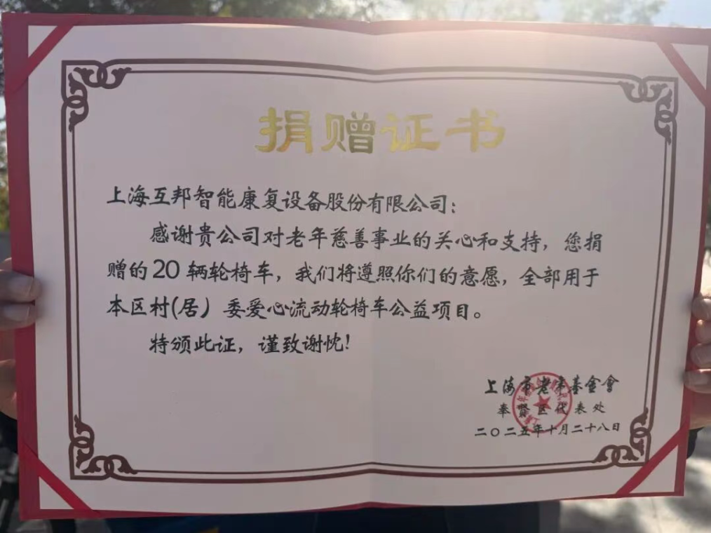 一輛輪椅,能承載多少溫暖與希望?在奉賢區(qū),一項覆蓋全區(qū)的“愛心流動輪椅”公益服務(wù)正穩(wěn)步推進,為老年人臨時出行難的問題提供切實可行的解決方案。作為國內(nèi)智能康復(fù)設(shè)備領(lǐng)域的先行者,互邦智能康復(fù)設(shè)備股份有限公司(以下簡稱“互邦”)積極參與該公益項目,以實際行動踐行企業(yè)社會責任,并在10月29日上海市老年基金會奉賢區(qū)代表處舉辦的愛心輪椅車贈送儀式上獲頒榮譽證書。本次奉賢區(qū)共籌集1800余輛嶄新輪椅,將陸續(xù)分發(fā)至全區(qū)365個村居委,構(gòu)建起一張便捷、靈活的輪椅免費租借網(wǎng)絡(luò),老年人僅需簽訂無償使用承諾書,即可根據(jù)實際需求短期租用,真正實現(xiàn)“輪椅流動、愛心常在”。